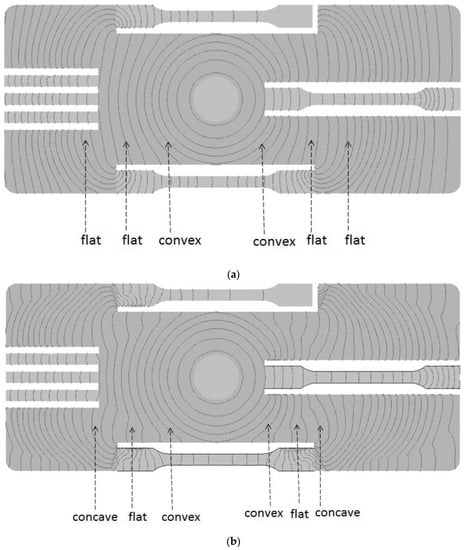 Finally, during the injection molding processing, the molten plastics are delivered from the sprue via the runner and gate and flow into the cavity. The melt flow front behavior is presented in Figure 13. Clearly, when the flow–fiber coupling is considered, the melt flow front exhibits “convex-flat-concave” behavior, while it shows “convex-flat-flat” behavior without flow–fiber coupling. This phenomenon is due to the free surface advancing faster along the side walls of the cavity due to the flow–fiber coupling effect. This flow–fiber coupling-induced melt flow behavior is similar to that described in Ref. [].