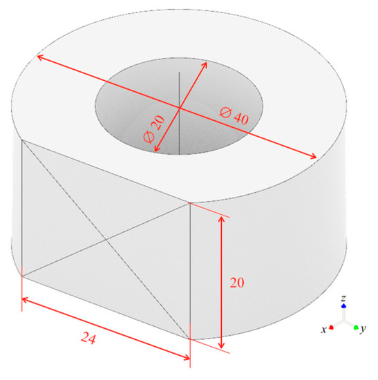 A surface of 24 × 20 mm2 on ∅ 40 × 20 mm2 holed cylinders was realized, as Figure 1 shows. The rough materials were an unreinforced natural PA66, named TECAMID 66, and a black 30% glass-fiber reinforced PA66, named TECAMID 66 GF30, supplied in the form of extruded rods by Ensinger GmbH (Nufringen, Germany). Table 1 reports the nominal properties of the materials.
