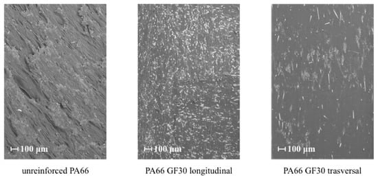 SEM images of the polyamide (PA)66 and PA66 GF30 part surfaces.