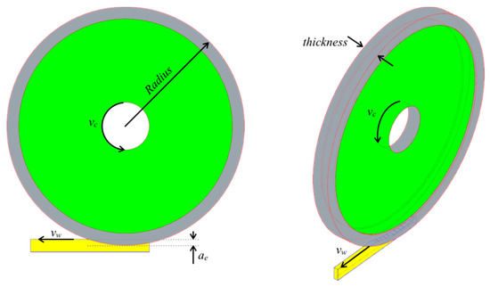 A rough pass and a consecutive finished pass were carried out. Attention was paid to the position of the component to observe the extrusion direction and, thus, the fiber direction. Three samples were realized for each pass with the same process parameters, measuring the average surface roughness at the end of each grinding step. An aluminum oxide (Al2O3) and a silicon carbide (SiC) wheel were used, with ∅ 406 mm × 30 mm dimensions. Al2O3 abrasive was cheap, versatile, and utilized in all grinding works. The fused Al2O3, combined with the vitrified ceramic matrix, exhibited excellent sharpness characteristics and enhanced wear resistances, as Kopac and Krajnik [14] report.
