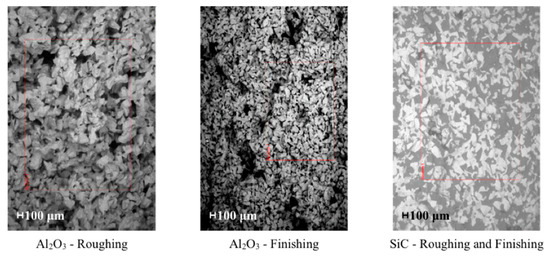 The SiC wheel, characterized by a needle-shaped abrasive grit, was a little bit more expensive and harder. It was primarily selected in application with parts made of high alloy steels, cast iron, non-ferrous metals, as Bhowmik and Naik [15] confirm. The grinding process is susceptible to the stochastic properties of the abrasive wheel, such as the grain shape and distribution within the matrix, and the matrix chemical and physical properties, citing Guerrini et al. [16]. Coarse grains and an open structure characterized the roughing wheels of both materials, allowing a high material removal volume to be achieved without tool kneading occurred. The finishing Al2O3 grinding wheel had a smaller grain size and a more closed structure. Figure 4 shows the images of the different grinding wheels acquired with SEM.