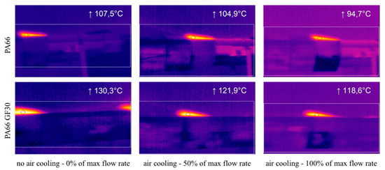The air-cooling condition varied from no flow (0% of the maximum flow rate) to full flow (100% of the maximum flow rate). Figure 5 shows the thermal fields acquired with the thermo-camera during processing. The maximum temperature reached between the tool and part surfaces was monitored using a virtual probe, and values reported in the same figures.