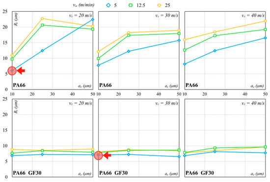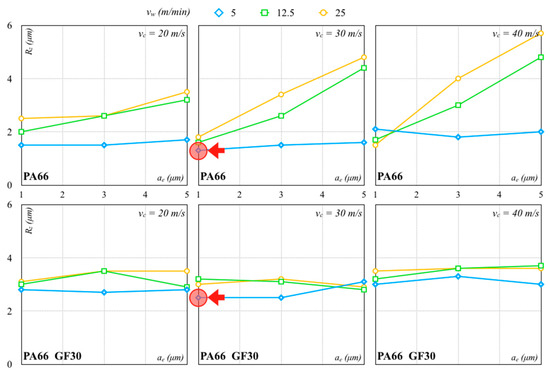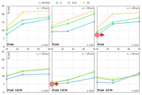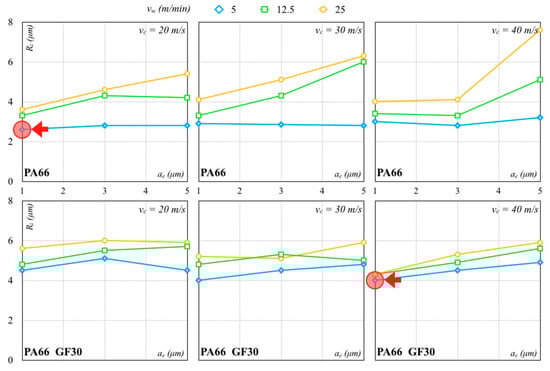 The Al2O3 wheel worked better than the SiC wheel because it produced lower forces and contributed to a better surface finish. The lowest Rz values with the Al2O3 and SiC grinding wheels were, respectively, 1.34 µm (σ equal to 0.08 µm) and 3.01 µm (σ equal to 0.02 µm) for PA66. The lowest Rz values with the Al2O3 and SiC grinding wheels for PA66 GF30 were, respectively, 2.53 µm (σ equal to 0.07 µm) and 3.99 µm (σ equal to 0.03 µm). These values were higher than those measured for the PA66. For lower vw, low dispersion of Rz was recorded, also with an increase in ae and vc. The Rz values of PA66 increased for all other combinations for the PA66 while remaining quite stable for the PA66 GF30. For higher vw values, the surface quality of PA66 rapidly worsened with an ae and vc increase, especially for higher values. The surface roughness of PA66 GF30 seemed to be less sensitive to these variations and not necessarily influenced by ae within the tested range. With regard to PA66, the processing conditions determined higher forces, producing higher surface roughness. Reduced surface roughness was usually associated with less fracture and strain generation. A lower ae generated lower cutting forces, with lower vibrations and a surface finish improvement. On the contrary, an ae increase promoted the heat generation and tool wear, causing a higher surface roughness.