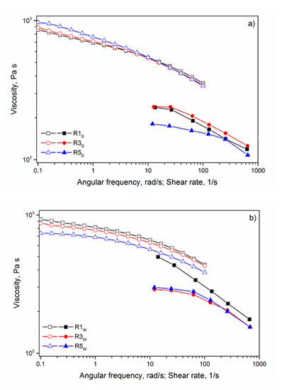 In Figure 1, the flow curves of the Ecovio, virgin and reprocessed three and five times, are reported for the samples processed in dry and wet conditions. The first feature to be observed was that the flow curves obtained in the rheometer and the flow curves measured in the capillary viscometer do not superimpose as predicted by the Cox–Merz rule. This means that the Cox–Merz equation did not hold for these systems. This feature was already found for the same Mater-Bi sample [29] and for other systems [30,31,32] and explained considering the multiphase nature of these polymer systems.