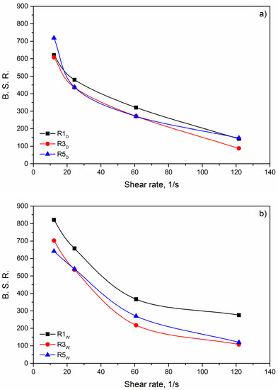 The breaking stretching ratio (BSR) as a function of the apparent shear rate is reported in Figure 3. The BSR curves present a mirror image of the MS curves as they decrease with increasing shear rate.