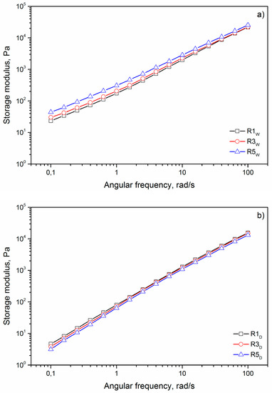 Storage modulus as a function of the frequency for (a) dry sample and (b) wet sample.