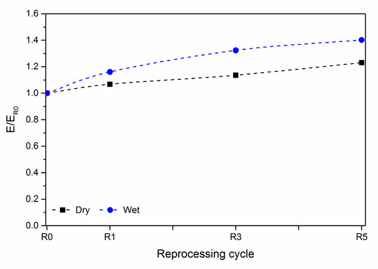 Dimensionless elastic modulus as a function of the reprocessing cycles.