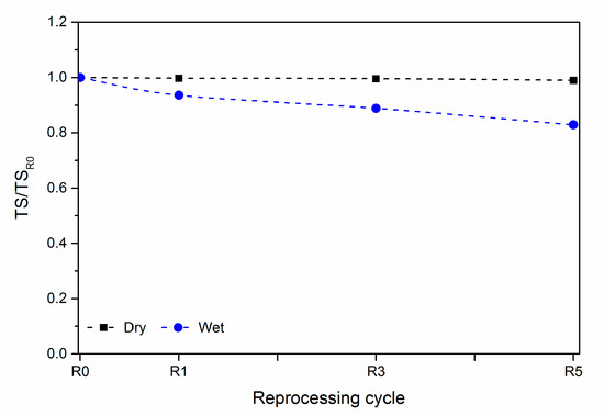 Dimensionless tensile strength as a function of the reprocessing cycles.