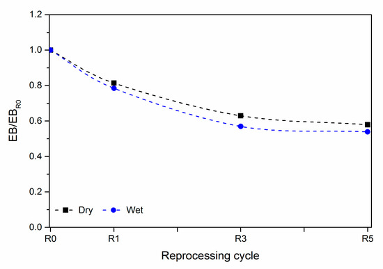In Figure 5, Figure 6 and Figure 7, the dimensionless values of the same mechanical properties are reported as a function of the reprocessing steps. The dimensionless values were obtained by dividing the values at a given recycling cycle by the value of the virgin polymer. For both reprocessing conditions, the elastic modulus increased while the elongation at break decreased with the number of extrusions. The tensile strength was almost constant or showed a slight decrease. While the reduction of the elongation at break can be ascribed to the reduction of the molecular weight during the reprocessing steps, the increase of the modulus was intepreted in previoius works [34,35] as the result of the increase of crystallinity due to the decrease of the molecular weight.