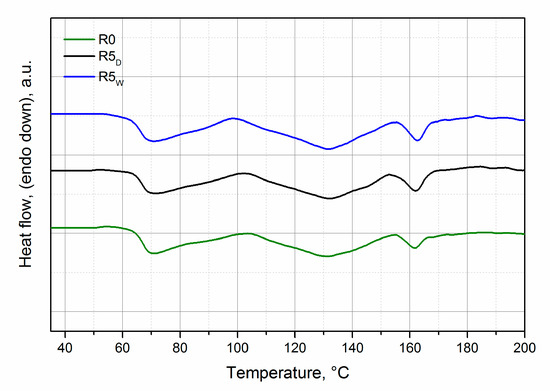 The increase of the crystallinity, responsible for the increase of the elastic modulus, was confirmed by thermograms of the virgin sample and of the samples reprocessed five times in dry and wet conditions (reported in Figure 8). The thermograms refer to the first heating in order to take into account the morphological variations that occurred in the sample due to the thermomechanical process. Although it is not possible to draw from the thermograms the values of the crystallinity of the two components because the formulation and the composition of the blend is not known, it is evident that the reprocessing cycles slightly increased both peaks of fusion of the two polymers (Table 3). The peak at lower temperature refers to the PBAT and the peak at higher temperature to the PLA. For the PBAT, the larger increase of crystallinity (Table 3) occurred when the reprocessing was carried out without any predrying. This was the result of the larger decrease of the molecular weight due to thermomechanical degradation and hydrolysis. As for the PLA, the enthalpy of fusion was very small, and the difference between the two samples was very small and within the experimental error. In conclusion, the increase of crystallinity occured mainly in the PBAT phase and, in particular, in wet conditions. In agreement with the previous experimeantal results, this means that the decrease of the molecular weight of the PBAT seemed more remarkable than that of the PLA, and a more marked decrease occured when the sample was not dried.