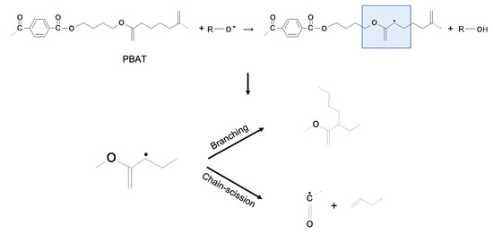 A possible scheme of the two mechanisms of degradation of PBAT is reported in Scheme 1. The carbon of the methyl group near the C=O group is prone to be attacked by a free radical, giving rise to a radical that can lead to both branching and chain scission.