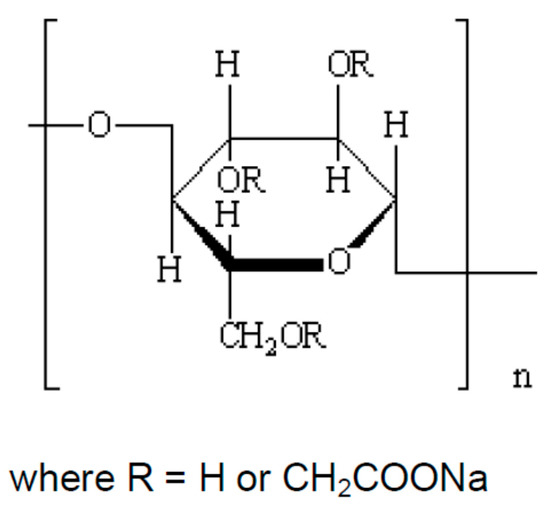 The polymer used in this work was Aqualon CMC (referred to as simply CMC). Aqualon CMC is purified sodium carboxymethyl cellulose. The chemical structure of CMC is shown in Figure 1. CMC is an anionic water soluble polymer, used extensively in applications related to food, pharmaceuticals, cosmetics, personal care, paper, and many more industries. It is often used as a rheology modifier or thickener to improve the stability of suspension and emulsion type products. It is manufactured by Ashland Inc., Covington, KY, USA. CMC is produced by reacting alkali cellulose with sodium monochloroacetate under strictly controlled conditions. It has a minimum purity of 99.5%. The molecular weight of CMC is approximately 700,000, and the degree of substitution is 0.7.