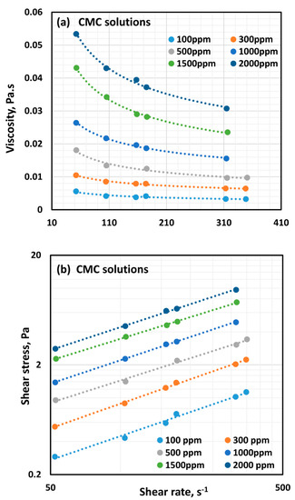 Flow curves for solutions of anionic polymer CMC at different polymer concentrations: (a) Viscosity versus shear rate and (b) Shear stress versus shear rate.