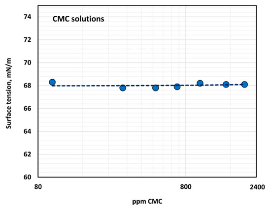 The surface tension versus polymer concentration plot is shown in Figure 4. The CMC polymer solutions exhibit negligible surface activity as the surface tension is close to that of water, and there is no dependence of surface tension on the polymer concentration.
