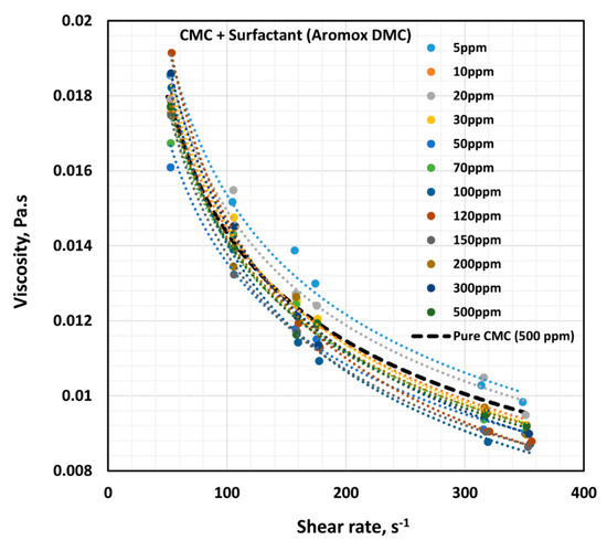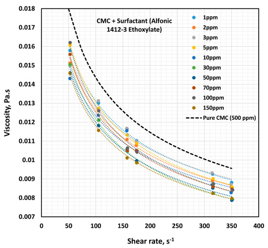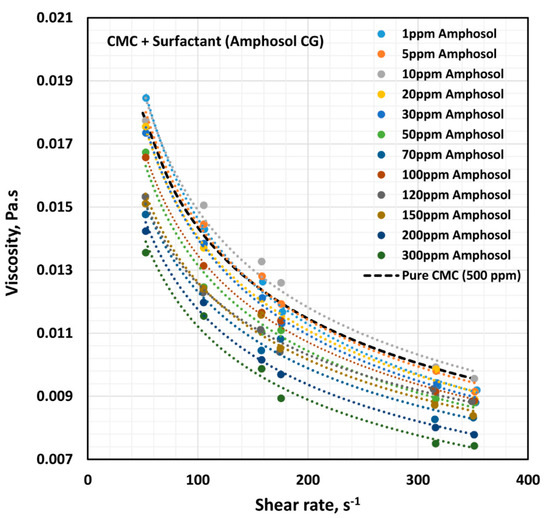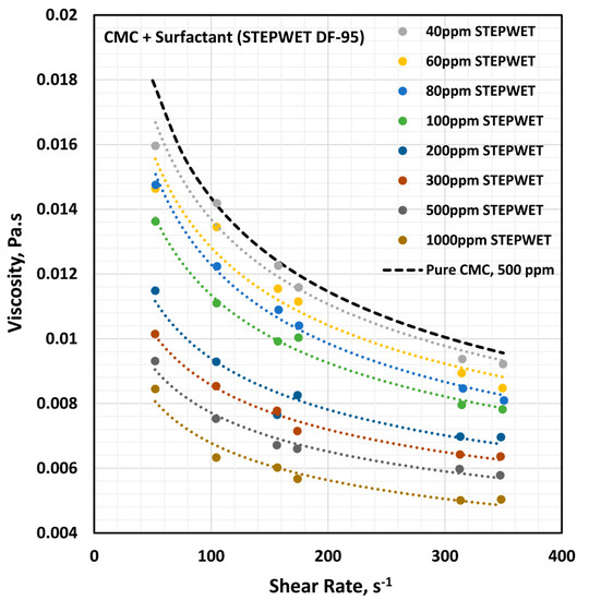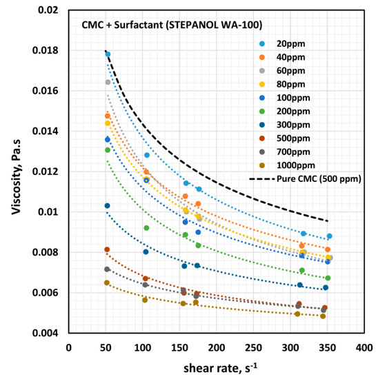 The influence of the anionic surfactant (Stepwet DF-95) on the viscosity of the anionic polymer (CMC) solutions at a fixed polymer concentration of 500 ppm is shown in Figure 5. The viscosity of the solution decreases with the increase in the surfactant concentration at any given shear rate. In addition, all solutions are shear-thinning. The flow curves (viscosity versus shear rate plots) at different surfactant concentrations are almost parallel to those of the pure polymer solution. The solutions followed the power law model (Equation (2)). The variations of consistency index, , and flow behavior index, , with the surfactant concentration are shown in Figure 6.
