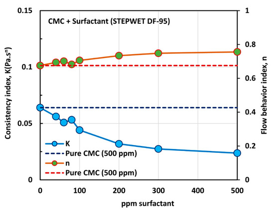 Variations of consistency index, , and flow behavior index, , for mixtures of anionic polymer, CMC, and anionic surfactant, Stepwet DF-95, with the increase in surfactant concentration, at a fixed polymer concentration of 500 ppm.