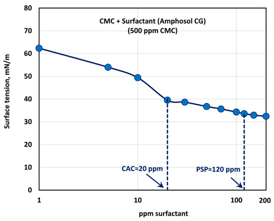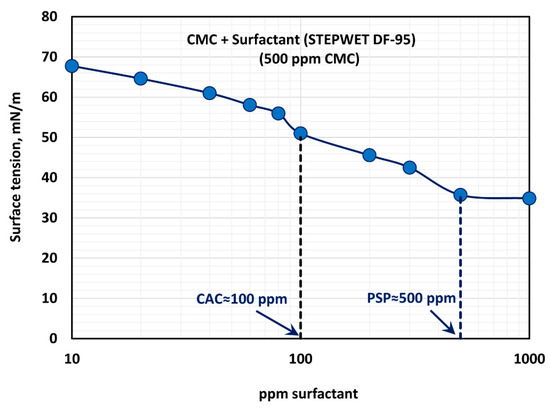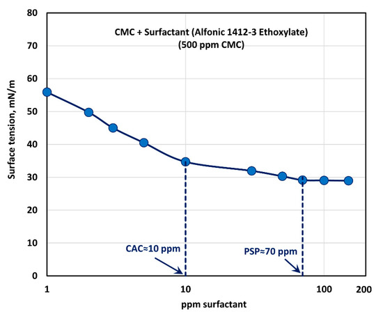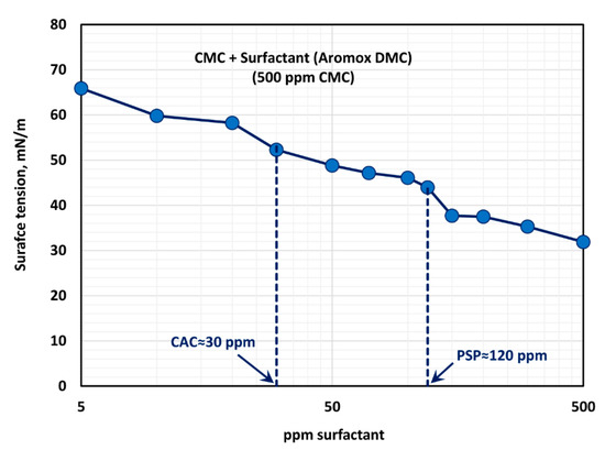 The surface tension behavior of polymer (CMC) + surfactant (Aromox DMC) solutions is shown in Figure 16, at a fixed polymer (CMC) concentration of 500 ppm. With the increase in the surfactant concentration, the surface tension decreases as expected. Most of the drop in surface tension occurs within the surfactant concentration range of 0–150 ppm. The surface tension versus surfactant concentration plot shows a first plateau in the surfactant concentration range of approximately 30 to 120 ppm. From 120–150 ppm, the surface tension drops significantly and then it tends to level off (second plateau) at a higher surfactant concentration. Thus, the CAC and PSP values are approximately 30 ppm and 120 ppm, respectively. These observations are consistent with the consistency behavior of surfactant-polymer mixtures.