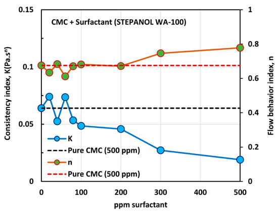 Variations of consistency index, , and flow behavior index, , for mixtures of anionic polymer CMC and anionic surfactant Stepanol WA-100 with the increase in surfactant concentration, at a fixed polymer concentration of 500 ppm.