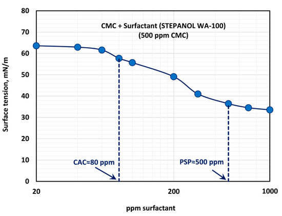 Figure 10 shows the effect of surfactant (Stepanol WA-100) concentration on the surface tension behavior of surfactant-polymer solutions at a fixed polymer (CMC) concentration of 500 ppm. With the increase in surfactant concentration, the surface tension decreases rapidly and then levels-off at high surfactant concentration (> 500 ppm). From the surface tension versus surfactant concentration plot, it appears that the CAC is approximately 80 ppm where we observe the first break in surface tension-surfactant concentration plot. The PSP (polymer saturation point) where the surface tension tends to level off is 500 ppm. Note that these observations are consistent with the and plots shown in Figure 9. The values of and are nearly constant up to a surfactant concentration of about 80 ppm. At higher surfactant concentrations, decreases and increases until the surfactant concentration reaches 500 ppm.