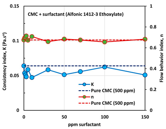 Variations of consistency index, and flow behavior index, , for mixtures of anionic polymer, CMC, and non-ionic surfactant, Alfonic 1412-3 Ethoxylate, with the increase in surfactant concentration, at a fixed polymer concentration of 500 ppm.