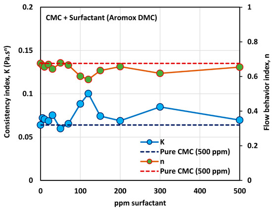 Variations of consistency index, , and flow behavior index, , for mixtures of anionic polymer, CMC, and non-ionic surfactant, Aromox DMC, with the increase in surfactant concentration, at a fixed polymer concentration of 500 ppm.