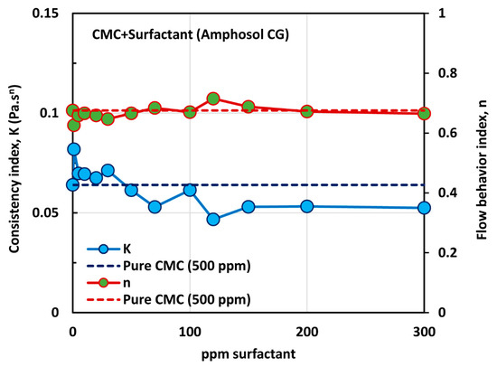 Variations of consistency index, , and flow behavior index, , for mixtures of anionic polymer, CMC, and zwitterionic surfactant, Amphosol CG, with the increase in surfactant concentration, at a fixed polymer concentration of 500 ppm.