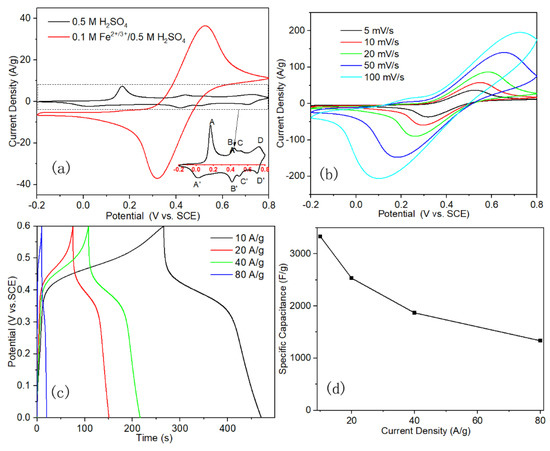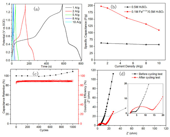 - Ren, L.; Zhang, G.; Yan, Z.; Kang, L.; Xu, H.; Shi, F.; Lei, Z.; Liu, Z.H. High capacitive property for supercapacitor using Fe3+/Fe2+ redox couple additive electrolyte. Electrochim. Acta 2017, 231, 705–712. [Google Scholar] [CrossRef]