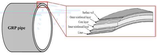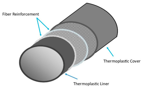 Thermoplastics liners follow the NACE RP-0304 standard 2nd edition for their design, installation, and operation in the oilfield pipelines. ISO 23936-1:2009 provides a summary regarding the performance of different thermoplastics with interaction with produced water, oil, and gas media along with chemical treatment []. Table 2 shows the usage of different NMP materials in the oil and gas pipeline applications. Figure 1 shows the different layers present inside the glass reinforced plastic (GRP) pipe while Figure 2 shows the internal and outer structure RTP pipe.