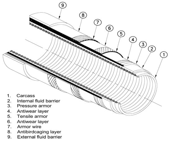 PE and PVDF are also used depending on their compatibility and chemical resistance. PE-100 liner was installed in 6” and 16” CS subsea pipelines by swagelining technique, its performance checked by bending and pressure testing. The liner showed the less flexural modulus and no rupture was seen during pressure testing []. PVDF is a viscoelastic material, and it gets thinner rather than producing a neck when tension is applied, one of the reasons for using it in flexible pipes []. PA has been used for 30 years in the flexible pipes due to its ability to bear the mechanical load in dynamic applications [,]. Plasticizers are added to improve the elasticity and reduced the strength. PA11 and PA12 can be used within the temperature range of 100 °C for the transportation of crude oil. However, Coflon (PVDF) will be used for higher temperatures and HDPE for hydrolytic resistance []. Figure 3 shows the layered structure of the flexible pipe.