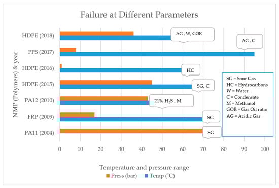 As we see from Figure 4, there are many failures adopted by NMP. Still, permeation is the prominent one, and it was studied by various researchers up until now in different environments on different materials. Permeation being the dominating factor in the polymer liner failure. In the presence of hydrocarbons, polyolefins swell as they both have a similar chemical structure. Polyamide degrades due to the presence of water at higher temperatures [].