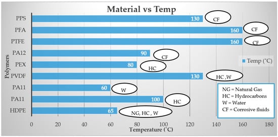 Now we know that different polymers are degraded in different specific environments. Figure 8 shows the temperature limits for using these polymer materials in the oil and gas industry in diverse environments.