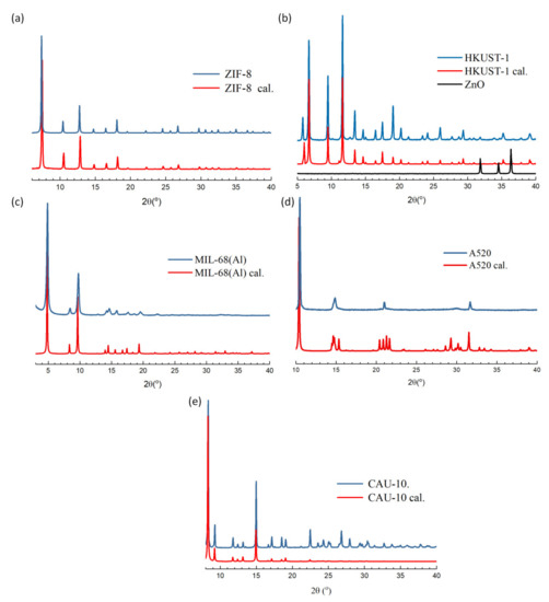 Powder pattern of (a) ZIF-8, (b) HKUST-1, (c) MIL-68(Al), (d) A520, and (e) CAU-10.