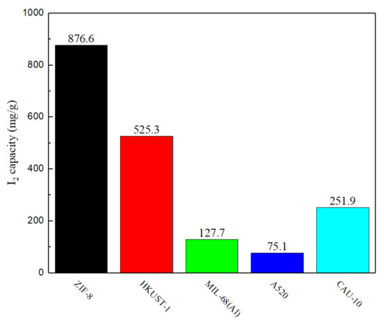 ZIF-8 has the highest iodine adsorption capacity, reaching 876.6 mg/g, followed by HKUST-1 with 525.3 mg/g, CAU-10, MIL-68, then A520, with 251.9, 127.7, and 75.1 mg/g, respectively (Figure 2). ZIF-8 exhibited an outstanding ability to capture iodine vapor compared to the other four types of MOF because from the perspective of its structure, it can be seen that ZIF-8 possesses a three-dimensional cage-like structure. When I2 molecules are adsorbed into the pores, this type of structure makes it difficult to leave. Contrarily, HKUST-1, MIL-68(Al), A520, and CAU-10 have two-dimensional pore and tunnel structures, thereby making molecules easier to leave through channels in the frameworks. This makes it difficult to trap iodine molecules, resulting in poor adsorption and capture ability. After the I2 capture, the sample changes from white or blue color to brown, as shown in the supporting information (Figure S2).
