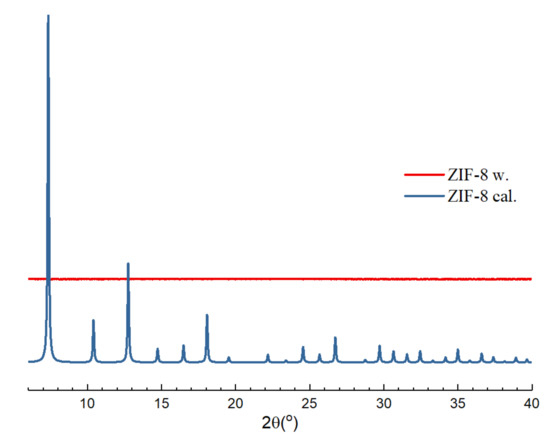 It can be observed that the diffraction spectrum of ZIF-8@PES d is comparable with the theoretical diffraction spectrum of ZIF-8 while the diffraction spectrum of ZIF-8@PES w is distinctly different with the calculated data. It is speculated here that although ZIF-8 has a certain degree of water stability, soaking ZIF-8 for too long will make the structure collapse. As water stability is usually evaluated by PXRD after soaking MOFs for a certain period of time [31], 0.1 g of ZIF-8 was immersed in 10 mL of H2O in a 20 mL sample bottle and stirred for 1 day at room temperature. It was then lyophilized for 1 day to obtain a white powder, ZIF-8 w.