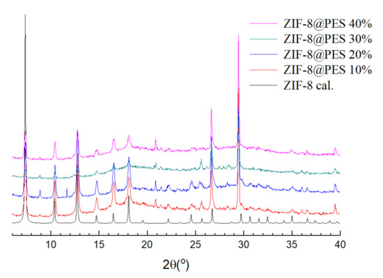 The MMMs prepared using different mixing ratios were also measured for their PXRD patterns and compared with the theoretical diffraction spectrum of ZIF-8 (Figure 5). It can be observed that PXRD patterns of the prepared MMMs are in good agreement with the calculated data with the exception of the appearance of a new peak at 28.5°, which is from PES as seen in the PXRD pattern of plain PES membrane in Figure S3.