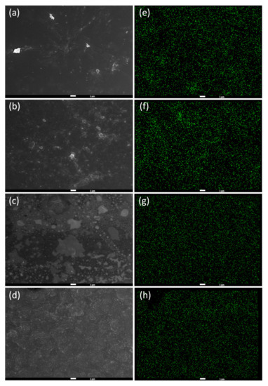 Observation of the surface morphology of the MMM was done using SEM at a magnification of 5 × 103 (Figure 7a–d). Granular particles with sizes around 1 μm can be observed on the surface of the ZIF-8@PES and the number of particles increases with the increase of the MOF mixing ratio. In order to prove that the dry-free method can uniformly disperse the MOF in the membrane, the films were subjected to SEM-EDX characterization. In Figure 7e–h, the green dots represent the zinc metal from ZIF-8 and it can be seen they are evenly distributed on the film. With this, it can be inferred that the dry-free method of MOF incorporation was able to uniformly disperse the MOF in the casting solution.