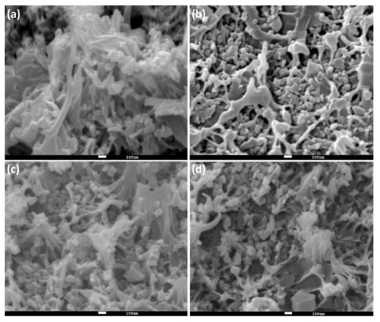 Under a magnification of 5 × 104 (Figure 8), it can be observed that ZIF-8@PES is comprised of a combination of materials where the polymer resembles a fibrous or thread-like shape, while the ZIF-8 is granular. Even at a high magnification, it can be observed that the granular material is uniformly dispersed in the MMM.