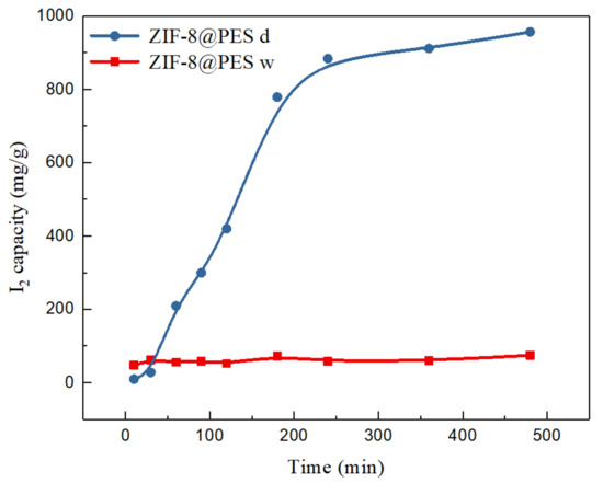 I2 adsorption curve of the prepared MMMs (ZIF-8@PES d in blue and ZIF-8@PES w in red).