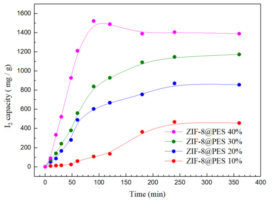 To further prove the significance of the ZIF-8 component for I2 capture, MMMs with different weight ratios of ZIF-8 were prepared using the dry method and tested for their I2 adsorption capacity, which are shown in Figure 11. It can be observed from the adsorption curve that ZIF-8@PES with different mixing ratios reaches the saturation point at around 4 h. Among the prepared MMMs, ZIF-8@PES 40 wt % has exhibited supersaturation during the initial part of the adsorption process at about 80 min. As the mixing ratio of MOF increases, the adsorption amount of I2 also increases gradually. It is worth noting that when the 30 and 40 wt % of MOF was incorporated into the MMM, the I2 capture increased to 1171.9 and 1387.6 mg/g, respectively, exhibiting an adsorption capacity that is far better than that of ZIF-8 itself, showing a higher I2 adsorption capacity compared to other MOF-polymer composites (Table S2). This astounding increase in the I2 capture is attributed to two possible reasons: (1) Upon observation of the surface morphology of ZIF-8@PES, interfacial gaps can be seen between ZIF-8 and PES leading to a void volume leading to an increase in the I2 adsorption capacity; and (2) as the dry-free method is used for the MOF incorporation into the membrane, ZIF-8 becomes uniformly dispersed in the matrix also leading to an increase in the I2 adsorption capacity.