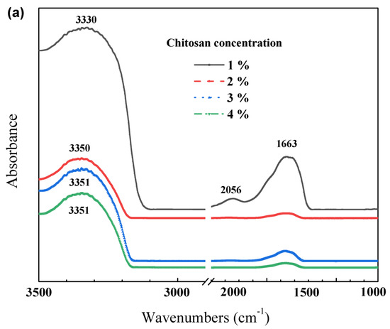 (a) FT-IR spectra for chitosan films and (b) ATR-FTIR spectra of the chitosan film with 2% chitosan concentration.