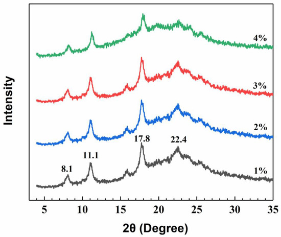 The crystalline structure of a packaging film plays an important role in maintaining its integrity during storage. XRD analysis was performed to check if the film preparation conditions affected the crystalline structure of films. Figure 3 showed the XRD patterns of GPC films with different chitosan concentrations. According to the study reported by Rhim et al. [43], the diffraction pattern of the chitosan power showed peaks at around 10.9° and 19.8°, which correspond to a hydrated crystalline structure due to the integration of water molecules in the crystal lattice and an amorphous structure of chitosan, respectively. As shown in Figure 3, the GPC films showed characteristic peaks at around 2θ = 8.1°, 11.1°, 17.8° and 22.4°, which were in agreement with the findings in previous publications [42,44,45]. The two peaks at 8.1° and 11.1° indicate a hydrated crystallite structure of chitosan, and the peak at 17.8° is attributed to the regular crystal lattice [36], while the broader peak at around 22.4° is due to an amorphous structure [44,45,46]. It is generally known that the structure of chitosan is strongly dependent on its origin, characteristics, such as degree of deacetylation and molecular weight, as well as processing treatment methods, for example dissolving, precipitation, heating and drying [43]. However, the crystalline structure of chitosan was not significantly affected through the chitosan film preparation process, as shown by the comparison of the XRD patterns in Figure 3.