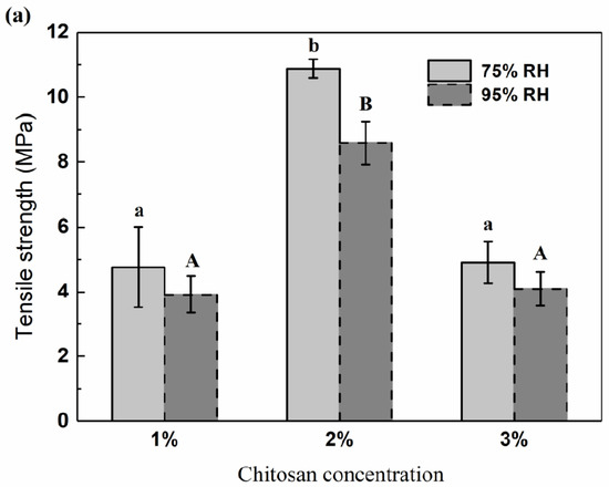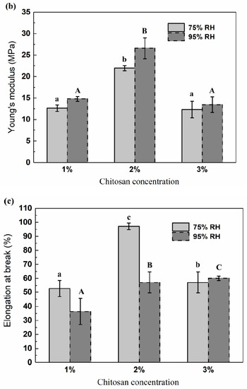 Mechanical properties of chitosan films: (a) tensile strength, (b) Young’s modulus and (c) elongation at break. Small letters in 75% RH group, p < 0.05; capital letters in 95% RH group, p < 0.05.
