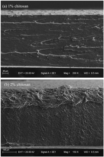 The film with 4% chitosan concentration is not shown in Figure 5 and Figure 6. This is because that the chitosan films became darker with the increase in the chitosan concentration, and the film with 4% chitosan possessed the worst physicochemical and moisture barrier properties, which makes the film with 4% chitosan concentration unsuitable for packaging film. Furthermore, after the specimens, 50 mm long dumbbells with 4 mm neck width, were cut from the film and balanced in 75% or 95% RH, there would be cracks on the surface of the specimens, which made the test data inaccurate.
