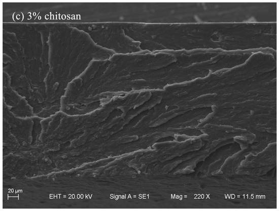 SEM micrographs of the tensile fractured surfaces’ panorama of chitosan films. Chitosan concentration is (a) 1%, (b) 2% and (c) 3%