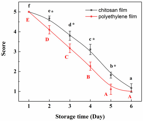 Sensory evaluation results of ground beef sealed with chitosan film and polyethylene film. Small letters in the chitosan film group, p < 0.05; capital letters in the polyethylene film group, p < 0.05; *, p < 0.05, compared with sensory scores of beef samples sealed with polyethylene film.