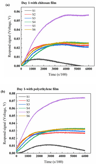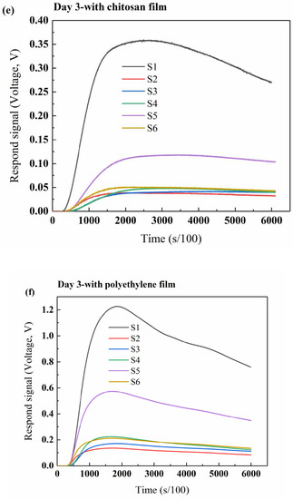 The b-electronic nose is always designed to detect and distinguish between complex odors according to the sensitivity ranges of the gas sensors [30,32,40,56,57]. Therefore, in food packaging, industry properties, such as shelf-life and freshness, can be investigated for any food or materials that give out volatile compounds. In this study, the b-electronic nose was used to monitor changes in the beef’s volatile compounds sealed with the chitosan films or polyethylene film during storage. The typical original electronic nose response signals of beef stored for different amounts of days are shown in Figure 8, where each line of different colors in the figure represents one gas sensor. Due to the continuous accumulation and reaction of volatile gases on the surface of the gas sensors, basically, for all the gas sensors, the response intensity increased from zero and the increase in strength was quick in the first 10 to 20 s detection; afterwards, the curves reached a maximum value and gradually became level. The different responses of the sensors indicated that the composition and content of volatile gases in the beef samples sealed with different films and stored for different amounts of days are different. During the first 2 days, the final response intensity of S5 (TGS2620) for the beef samples sealed with chitosan film or polyethylene film was the highest among all sensors (Figure 8a-d), revealing that alcohol is the main volatile component in the early days of beef storage.