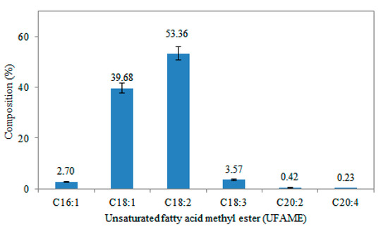 Unsaturated fatty acid methyl ester composition of Chlorella vulgaris microalgae. The bars indicate significant differences at p < 0.05.