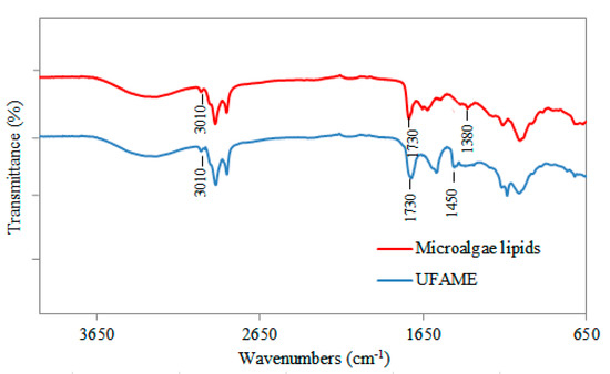 The FT-IR spectra for the microalgae lipids and the UFAME obtained under optimal conditions are presented in Figure 3. Although few differences are observed, peaks appear in the region between 1800–1700 cm−1 that can be attributed to the stretching of C=O of the ester groups of lipids and UFAME. Moreover, the peak at 1450 cm−1 can correspond to an asymmetric stretching of -CH3 present in the UFAME spectrum and the peak at 1380 cm−1 can be attributed to O-CH2 groups in the glycerol of the lipids [18,19].