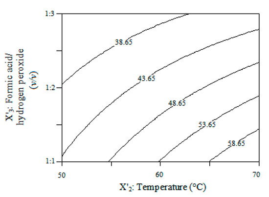 Contour plot for the effect of formic acid/hydrogen peroxide (X’3, v/v) and temperature (X’2, °C) on EUFAME yield.