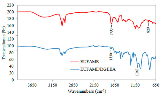 Bio-based epoxy blend was prepared from a mixture of EUFAME and DGEBA, with 10 wt% of EUFAME added to DGEBA. The changes in the functional groups due to crosslink networks cured with TEPA of the FT-IR spectrum are shown in Figure 5 (see EUFAME/DGEBA). According to the results, it was observed that the absorption band located at 820 cm−1 corresponding to the epoxide ring present in uncured EUFAME disappeared after the curing process. This confirms that the epoxide group reacts with zwitterions generated from the curing agent [23]. In the EUFAME/DGEBA spectrum, the band located at 1043 cm−1 corresponds to C-O-C groups of the crosslinked epoxy network [23,24]. With regard to the band located at around 1730 cm−1, an overlap of the peak of crosslinked EUFAME and C=O stretching of the EUFAME ester groups are observed.